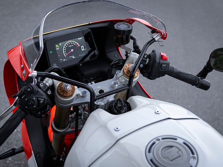 Das gilt ebenso für die IMU-basierte Fahrassistenz-Elektronik samt Wheelie-Kontrolle und vielfach regelbarer Traktionskontrolle sowie für das gut ablesbare TFT-Display. Es beherrscht alle Konnektivitäts-Gimmicks, zeigt in Verbindung mit einem gekoppelten Smartphone auf der Basis von Garmin Street Cross sogar die zuvor ausgewählte Strecke als Karte an. Nutzt man diese Technik nicht, präsentiert das Display einen großen, halbrunden Drehzahlmesser; auch dies ein stilistischer Leckerbissen. Umständlich ist alleine die Installation des Smartphone-Kabels am serienmäßigen USB-C-Port; er liegt unter einer Cockpit-Abdeckung, deren drei Clips dazu mit Werkzeug gelöst werden müssen.