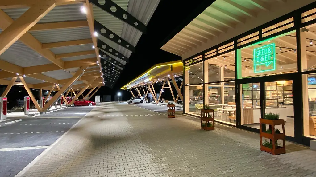 Auch in Deutschland gibt es bereits vergleichbare Anlagen, etwa seit 2020 den Schnellladepark Seed & Greet am Hildener Kreuz der Autobahn 3. Initiator ist der regional bekannte Bäcker Roland Schüren, der bei seiner Firmenflotte schon früh auf E-Autos gesetzt hat und mit Ladesäulen seinen eigenen Verkaufsbetrieb schnell zu einem Anlaufpunkt für die zunächst kleine, aber stetig wachsende E-Fahrer-Szene gemacht hat. Am Rande der großen Nord-Süd-Autobahn führt er das Konzept nun auf die nächste Stufe: Perspektivisch soll die Anlage 40 Tesla-Supercharger, 22 Fastned-Säulen und 52 AC-Ladepunkte bieten. Für die kulinarische Versorgung sorgt ein von dem Bäcker betriebener Imbiss, der neben Getränken und Brötchen auch frisch gebackene Pizza offeriert. Später sollen auf dem Gelände auch noch ein Bürogebäude sowie ein vertikales Gewächshaus entstehen. Dort werden auf 1000 Quadratmetern über vier Stockwerke Salat, Erdbeeren und Blaubeeren für den Bedarf der Bäckerei angebaut.