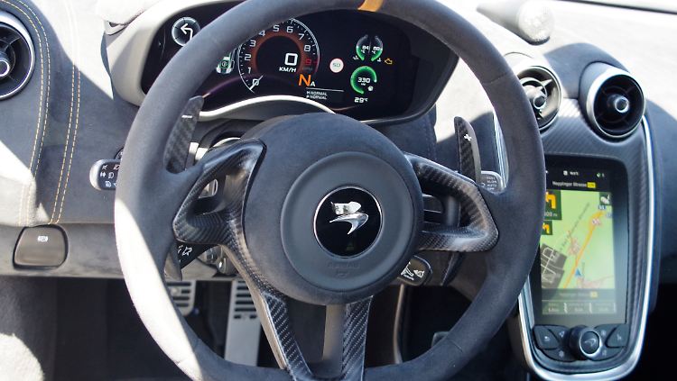 Zurück zum orangenen Racer. Ein bisschen sportlich verrenken, schon sitzt man hinter dem leicht unrunden Alcantara-Lenkrad. Die Hände schwitzen ein wenig, der hochgezüchtete Flatplane-V8 mit 3,8 Litern und satten 600 PS bollert nicht, sondern sirrt nach Drücken des Startknopfs fast los. Sound hat der 600 LT wahrlich, aber er macht irgendwie kein Bohei um seine nahezu ballistischen Beschleunigungswerte. Ein großes deutsches Automagazin hat neulich gemessen, dass der Bolide binnen 8,9 Sekunden von 0 auf 200 km/h beschleunigt. Bämm.