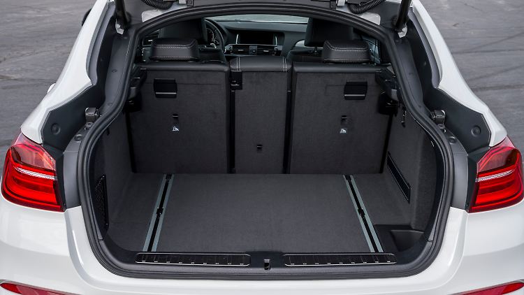 Trotz der flacheren Dachlinie bietet er aber ordentliche Platzverhältnisse für die Insassen. Damit es nicht zu unschönen Berührungen des Kopfs am Dachhimmel kommt, hat BMW in die Trickkiste gegriffen. Das Gestühl in der ersten Reihe ist im Vergleich zum X3 um zwei Zentimeter abgesenkt, die hinteren Sitze sind sogar drei Zentimeter tiefer montiert. Der Kofferraum fällt allerdings mit 500 Liter in der Standardstellung und bis zu 1400 Litern bei umgelegten Rücksitzlehnen deutlich kleiner aus als bei der etwas weniger schicken Karosserievariante (550 bis 1600 Liter). Im Innenraum profitiert der X4 von den 2014 vollzogenen Facelift-Verbesserungen für den X3. Solide Verarbeitung und angenehme Materialien finden sich im gesamten Cockpit.