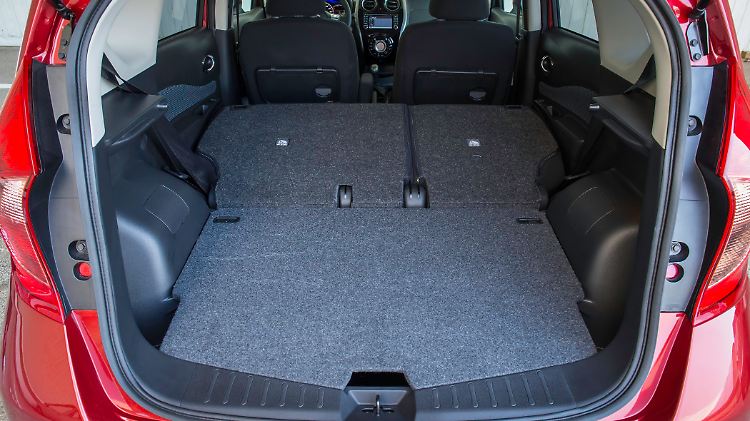 Die Architektur teilt sich der 4,10 Meter lange Nissan Note mit dem Renault Modus. Hinter den fünf Türen und der steil ansteigenden Schulterlinie verbirgt sich ein wahres Raumwunder. Das Platzangebot im Fond sucht in dieser Klasse seinesgleichen und schlägt dank der verschiebbaren Rückbank auch größere Fahrzeuge. Das Konzept kommt auch dem Gepäckraum zugute, hier passen mindestens 325 Liter mit nach hinten geschobener Sitzreihe beziehungsweise 411 mit weniger Platz im Fond rein. Legt man die hinteren Lehnen um, schluckt der Note beeindruckende 2012 Liter – mehr als ein VW Passat Variant. Cooles Feature: Mittels eines Einlegebodens lässt sich die Ladekante des Note egalisieren, ideal fürs Ein- und Ausladen von Getränkekisten.