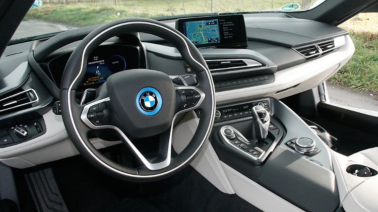 Am Straßenrand drehen sich die Köpfe, wenn die Flügeltüren des i8 hochschwingen. Die breiten Schweller der Karbonzelle verlangen, dass man sich einen geänderten Bewegungsrhythmus zum Einsteigen aneignet als bei herkömmlichen Karosserien. Ist die Übung erlernt, kann man sehr elegant in die Sitzschalen gleiten. Was die Insassen wahrnehmen, dürfte dem nahe kommen, was Leonard Nemoy alias "Mr. Spock" am ersten Drehtag zu "Enterprise" am Set vorfand. Das Cockpit-Styling ist nicht weniger aufregend als die Außenhülle, elegante Schwünge und lichte Abdeckungen, das Design der Anzeigen ändert sich je nach Fahrmodus: Blau für Comfort, Rot für Sport, weiß für Verbrauchs- und Reichweitenanzeige.