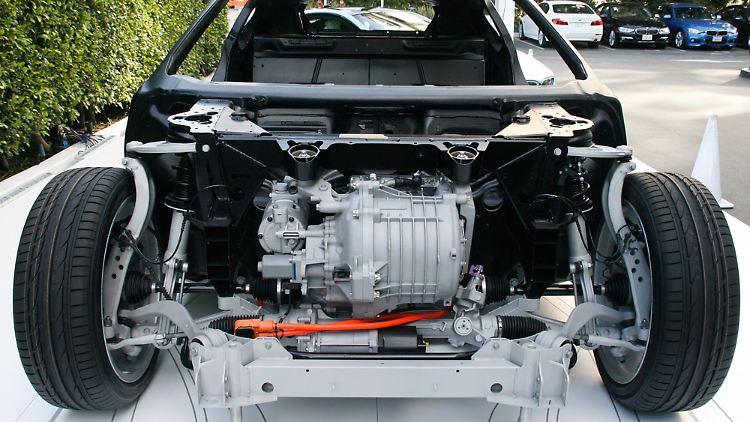 Dies sind die wichtigsten Elemente in der i8-Galaxis: E-Motor auf der Vorderachse, Dreizylinder-Benziner hinter der Passagierkabine, Lithium-Ionen-Akku zum rein elektrischen Fahren und Aufladen an der Steckdose. Nimmt man den mit Range Extender ausgestatteten BMW i3 zum Vergleich, ist die Anordnung der wichtigsten Bauteile praktisch identisch, nur die Fahrtrichtung ist unterschiedlich. Mit dem richtigen Anschluss sind 80 Prozent der Batterieladung binnen zwei Stunden wieder hergestellt.