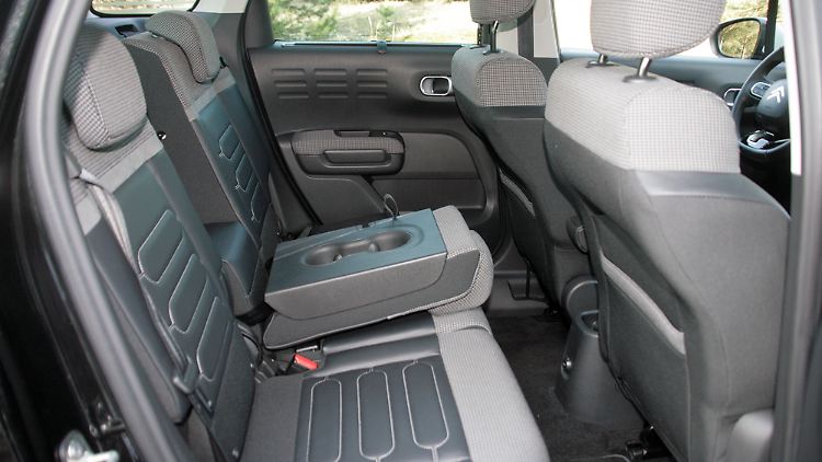 Die extravagante Innenarchitektur scheint dem Prinzip zu folgen, rechte Winkel, wo es geht, zu vermeiden. Monitore werden deshalb nicht oval und Handschuhfachklappen nicht zum Trapez. Aber an vielen Tasten, Ablagen, Ausströmern, Verkleidungen und Einfassungen finden sich abgerundete Winkel. Wenn auch nicht unbedingt handlicher als herkömmliche Griffe, ist der wulstige Knauf der Hebelhandbremse doch eine optisch originelle Variante. Die Sitze sind breit und komfortabel, lassen jedoch den Seitenhalt vermissen. Punkte für Variabilität im Innenraum erhält der Aircross durch die verschiebbare Rückbank und die umlegbare Lehne des Fahrersitzes. Um beides zu erhalten, muss man allerdings ein Family-Paket ordern, die Top-Ausstattung Shine bringt wenigstens die verschiebbare Rückbank mit.