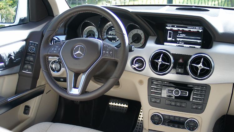 Im Innenraum haben sich die Designer an das Äußere gehalten und auf Rundungen weitgehend verzichtet. Lediglich die neuen Runddüsen fallen hier angenehm aus dem Rahmen. Insgesamt wird die Formsprache konsequent fortgesetzt. Bei Nachtfahrten taucht die als Option erstmals für den GLK angebotene Ambiente-Beleuchtung mit LED-Technik den Innenraum in samtenes Licht. Auf Wunsch gibt es ein großes Farbdisplay als Info-Monitor für das Kombiinstrument vor dem Fahrer.