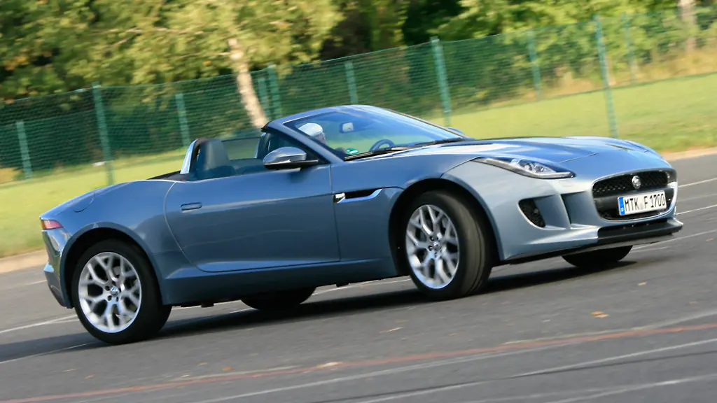 Die scharf gezeichnete Kante am Heckdeckel versteckt gekonnt den ausfahrbaren Spoiler, der sich bei Geschwindigkeiten von mehr als 100 km/h in den Wind stellt. Die flachen Rückleuchten und der optisch nach oben gezogene Überhang hinten vermitteln Charakter und Dynamik. Der längere Überhang vorn hält die Spannung aufrecht, die senkrechten Lufteinlässe bieten einen Kontrast zur rund angelegten Geometrie des Bugs. Wenngleich man sich beim Styling des Frontgrills mehr Eigenständigkeit und eine zuverlässige Abgrenzung von vergleichbaren Sportwagen italienischer Herkunft hätte wünschen können, bleibt der F-Type doch ein Hingucker. Sicher nicht zufällig sind die Werte von Länge und Höhe sehr nah am Porsche 911 Cabrio, doch fast 17 Zentimeter mehr Radstand lassen den Jaguar gestreckter erscheinen. Da die Türgriffe versenkt sind, stört kein Fremdkörper die harmonische Seitenlinie.