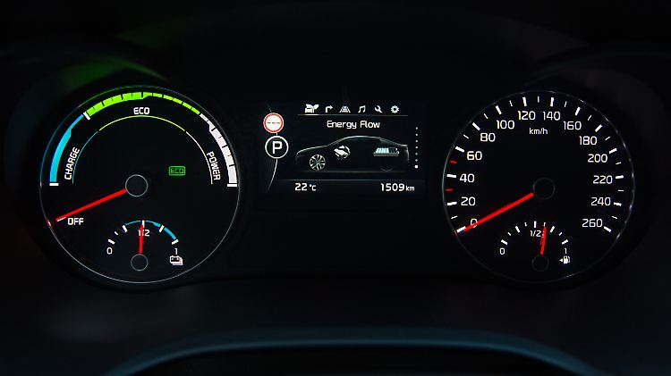 Unter günstigsten Umständen soll der Optima Hybrid rund 50 Kilometer emissionsfrei zurücklegen können. Auf seiner Website spricht der Hersteller von 54 km elektrischer Reichweite, nach einer Nacht an der Haushalts-Steckdose zeigte der Testwagen eine Distanz von 53 Kilometern an. Doch es fehlt die Möglichkeit, das präzise zu überprüfen. Dazu müsste man einen rein elektrischen Fahrmodus wählen können, der das Zuschalten des Verbrenners komplett unterbindet. Diesen Modus gibt es nicht und selbst bei vollständig geladenem Akku schaltet sich beim Starten erst einmal der Vierzylinder ein. Der Hersteller begründet das damit, dass zum Beispiel bei kühlen Außentemperaturen der Benzinmotor das Kühlwasser erwärmen soll, um den Innenraum heizen zu können und die Batterieladung für den Fahrbetrieb zu schonen.