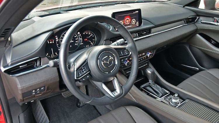 Manchmal darf man über die Unaufgeregtheit eines Autos im positivsten Sinne des Wortes überrascht sein. Eben dann, wenn nichts, aber auch gar nichts Fahrer und Fahrzeug aus der Ruhe bringt. Natürlich liegt das auch an den Assistenzsystemen wie Spurhalte- und Totwinkelwarner, an dem wunderbar funktionierenden adaptiven Start-Stopp-System, das nicht nur Fahrzeugen folgt, bei Bedarf bis zum Stillstand bremst und wieder Fahrt aufnimmt - es liegt am stimmigen Gesamtpaket des Mazda6. Zum Praxistest bei n-tv.de fuhr er als Kombi in der Ausstattungslinie Sports-Line vor. Hier ist zum Basispreis von 35.800 Euro so gut wie alles enthalten, was das Autofahrerherz höher schlagen lässt. Wer zusätzliche 3450 Euro für das Sports-Line-Plus-Paket investiert, bekommt dann auch noch Ledersitze, LED-Licht, einen titanfarbenen Frontgrill, Holz- und Chromintarsien sowie einen schwarzen Dachhimmel.