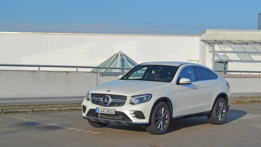 Natürlich sind die Leistungsdaten lange nicht so spektakulär wie bei den Brüdern aus Affalterbach. Dennoch, der GLC funktioniert auch mit dieser Motorisierung ganz prima. Obgleich es schon ein Unterschied ist, ob man das SUV oder das sportliche Coupé bewegt. Nicht nur, dass die Optik dank der abfallenden Dachlinie das stämmige Heck und die wuchtigen Lufteinlässe an der Front das SUV-Coupé um ein Vielfaches dynamischer wirken lässt, auch das Fahrverhalten unterscheidet sich. Der fehlende hohe Aufbau lässt das Coupé deutlich leichtfüßiger durch Kurven ziehen, sorgt aber auch dafür, dass man sich als Erster an der Ampel furchtbar verrenken muss, um das Lichtleitsystem im Auge zu behalten. Das hat zwei Gründe: der eine ist die stark abfallende Frontscheibe, der zweite die hinter dem Rückspiegel verbaute Einheit für Sensoren und Kameras.