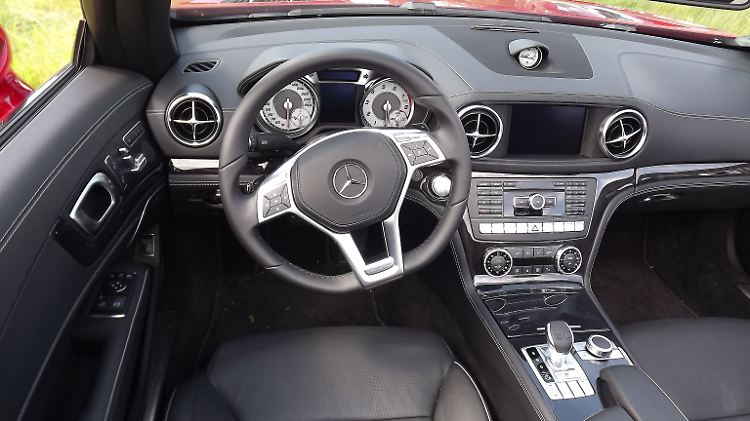 Hinzu kommt, dass der Pilot und eine eventuelle Begleitung in einem extrem angenehmen Ambiente untergebracht sind. Im Vergleich zu seinem Vorgänger wuchs der SL nämlich um 5 Zentimeter in die Länge und 5,7 Zentimeter in die Breite. Das bedeutet für die Insassen mehr Schulter- und Ellbogenfreiheit. Aber nicht nur das für einen Roadster üppige Platzangebot erfreut, sondern auch das ebenfalls gelungene Interieur. Auch hier bilden das Jetzt und die Vergangenheit eine perfekte Einheit: Luftauslässe in Turbinenoptik und Sportlenkrad zitieren erneut die Rennwagenhistorie der Schwaben. Gleiches gilt für die Rundinstrumente mit dem dreidimensionalen Skalenring.
