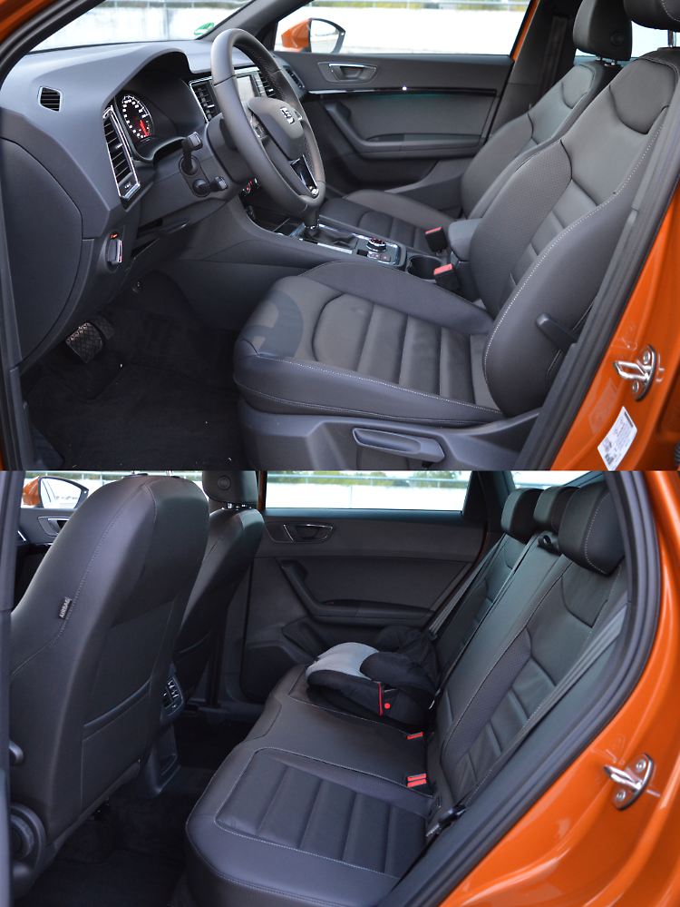 Und tatsächlich: In den Maßen trennt die beiden SUV nur wenig. Mit 4,36 Metern Länge ist der Spanier 13 Zentimeter kürzer als der Wolfsburger. In der Höhe sind es lediglich zwei Zentimeter, die der Tiguan den Ateca überragt und die Breite differiert lediglich um einen Zentimeter. Das ist nichts, der geringe Unterschied spiegelt sich letztlich auch im Innenraum des Spaniers wider: Das Raumangebot ist in beiden Reihen grandios. Selbst größere Reisende sollten hier keine Probleme mit Kopf und Knie bekommen und Kinder können entspannt die Beine baumeln lassen.