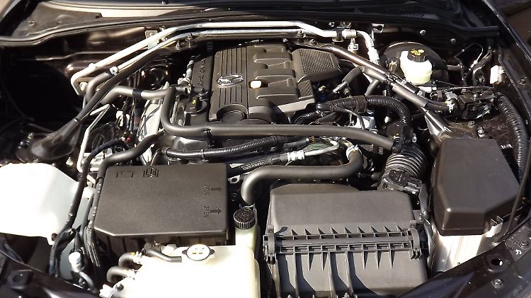 Für den Vortrieb sorgt im Testwagen ein 1,8-Liter-MZR-Benzinmotor. Der ist nicht wirklich neu, wurde schon in den älteren Modellen verbaut und ist mit seiner Fünfgang-Schaltung nicht mehr ganz zeitgemäß. Allerdings wurde zur Steigerung der Effizienz die Achsübersetzung von 4100 auf 3909 geändert. Dadurch soll sich der Kraftstoffverbrauch laut Mazda auf 7,1 Liter auf 100 Kilometer verringern und der CO2-Ausstoß sinkt auf 167 g/km. Zum Sparkünstler wird der MX-5 dadurch aber nicht. Allein durch die von ihm geforderte sportliche Fahrweise dürfte der Spritverbrauch im Durchschnitt deutlich höher liegen. Der Testwagen verlangte, bei zugegeben sehr sportlicher Fahrweise, etwa 10 Liter im Schnitt.