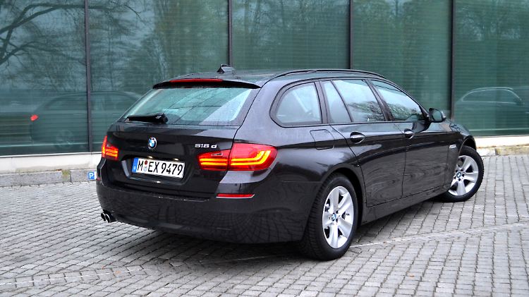 Witzigerweise wirken die feinen Retuschen beim hierzulande beliebteren Touring noch besser als bei der Limousine. Die Reling auf dem Dach ist wie ein Zierstreifen integriert und fließt sanft in die C-Säule. Die Haifischflosse steht straff im Wind und bildet eine Einheit mit dem Dachspoiler. Die Heckleuchten wachsen mit kühn geschwungenen LED-Streifen aus dem Kotflügel und unter der Schürze drohen zwei chromverblendete Endrohre. Aber genau hier liegt der Haken: Die künden nämlich nicht von der vernichtenden Kraft der Maschine, die unter der langgestreckten Motorhaube arbeitet, sondern dienen wirklich nur als Auslass für die Abgase. Denn jeder, der sich ein wenig auskennt, weiß, was der Schriftzug 518d am Heck des Testwagens bedeutet: Hier werkelt das kleinste je in einem 5er verbaute Triebwerk. Der 2,0-Liter-Diesel leistet lediglich 143 PS. Nimmt man jetzt das Leergewicht von 1,8 Tonnen des 4,90 Meter langen Bayern zur Grundlage, ist die Frage durchaus gerechtfertigt, ob dieses "Motörchen" denn die Fuhre noch im Sinne der drei Buchstaben in Fahrt bringt.