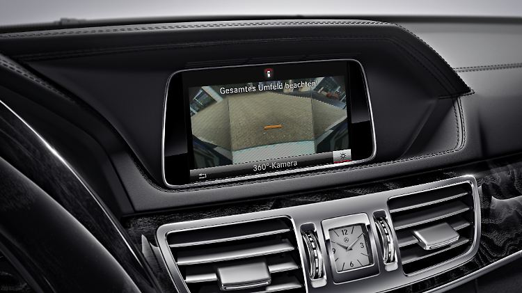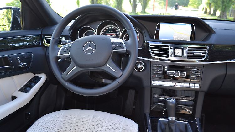 Wer das Volant eines E 250 in der Ausstattungslinie Elegance in der Hand hält, findet sich in einem ausgesprochen hochwertigen Ambiente wieder. Neben lederumsäumten Armaturen und Vierspeichen-Multifunktionslenkrad säumen schwarze Eschennachbildungen die Türinnenverkleidungen und die in gebürstetem Aluminium gehaltenen Luftauslässe für die Zweizonen-Klimaautomatik. Wer seinen Blick unter das über der Mittelkonsole verbaute 5,8 Zoll große Display schweifen lässt, erkennt dort eine Anleihe aus der alten S-Klasse: die Analoguhr. Bei Mitfahrern schieden sich hier die Geister, ob das elegant oder altmodisch sei. Letztlich passt sie sich aber ausgesprochen gut in das Gesamtambiente ein und zeigt, dass Mercedes die Entfernung zwischen S- und E-Klasse wieder ein Stück verringert hat. Das ist auch daran zu messen, dass zum Beispiel die 360-Grad-Kamera, eine Erfindung für den Luxusliner, zuerst im neuen GL und nun auch in der E-Klasse angeboten wird.