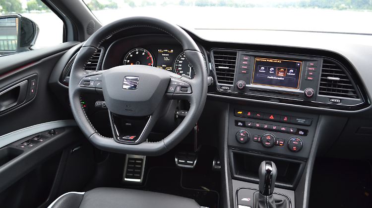 Aber egal. In den straffen Sportsitzen, die es wahlweise auch mit zweifarbigen Lederbezügen für 1200 Euro gibt, hat der Pilot die Wahl zwischen vier Fahrmodi: Komfort, Sport, Cupra und Individuell. Wer es wissen will, der setzt natürlich auf Cupra. Bis dahin sind es genau drei Drücker auf den Knopf mit der Rennfahne und die Nadel des Drehzahlmessers schnellt an die 3000. Die Gaskennlinie verdichtet sich und das im Komfort-Modus durchaus spürbare Turbo-Loch hat hier keine Chance mehr. Wer hier den Pin aus dem Stand durchtritt, spürt das wütende Reißen von 350 Newtonmetern an den Vorderrädern. Und obwohl die elektronischen Helferlein später eingreifen als normal, flackert die ESP-Leuchte wie eine Disco-Beleuchtung. Dank dessen und der Vorderachs-Differentialsperre verabschiedet sich der spanische Stier aber nicht aus der mit dem abgeflachten Volant vorgegebenen Spur, sondern schießt wie an der Schnur gezogen nach vorne weg.
