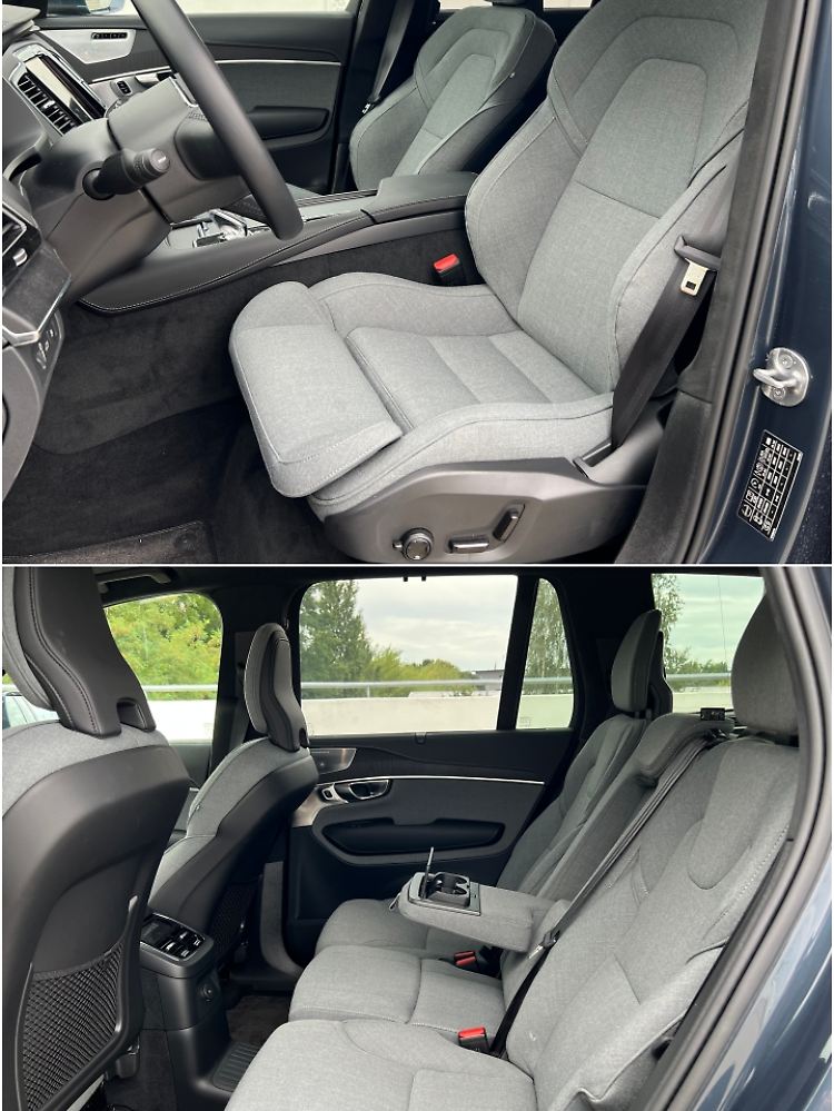 Angewählt über das Zentraldisplay in der Mittelkonsole senkt die Luftfederung den Brocken um einen Zentimeter ab, strafft die Dämpfer und reduziert die Nick-, Tauch- und Rollneigung bei starker Beschleunigung, scharfem Abbremsen oder einer unvermittelten Lenkbewegung. Na gut, all das macht das System ab Tempo 110, auch wenn man ganz entspannt im Hybrid-Modus auf die Langstrecke geht. Denn das ist ja seit eh und je die Lieblingsdisziplin eines XC90. Eingepasst in die unschlagbar bequemen Sportsitze möchte man hier gar nicht mehr aussteigen. Zu überlegen ist allerdings, ob man sie als Tailored Wool für 1250 Euro extra bestellt. Der graue Wollbezug kommt doch recht fleckenempfindlich daher.