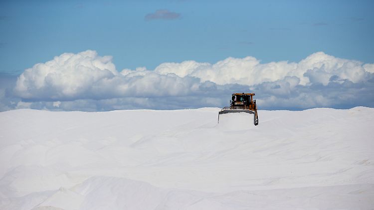 Ein bisschen Helligkeit? Nicht unbedingt auf den ersten Blick ist zu erkennen, was hier vor sich geht - oder fährt. Ein Bulldozer schiebt in der größten Salzabbaustätte der Welt das weiße Gut vor sich her. Die angrenzende Stadt heißt farblich unpassend "Guerrero Negro", also schwarzer Krieger, sie liegt in Mexiko.