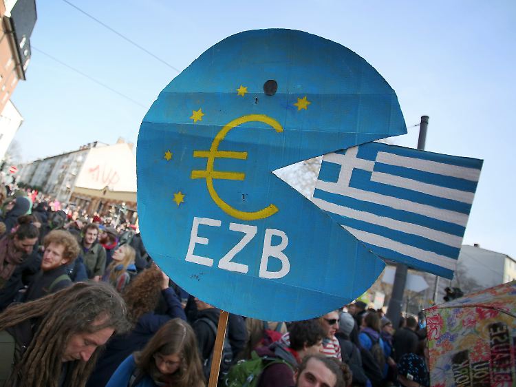 So sehen die Blockupy-Demonstranten in Frankfurt die Situation: Der blaue EZB-Pacman frisst Griechenland.