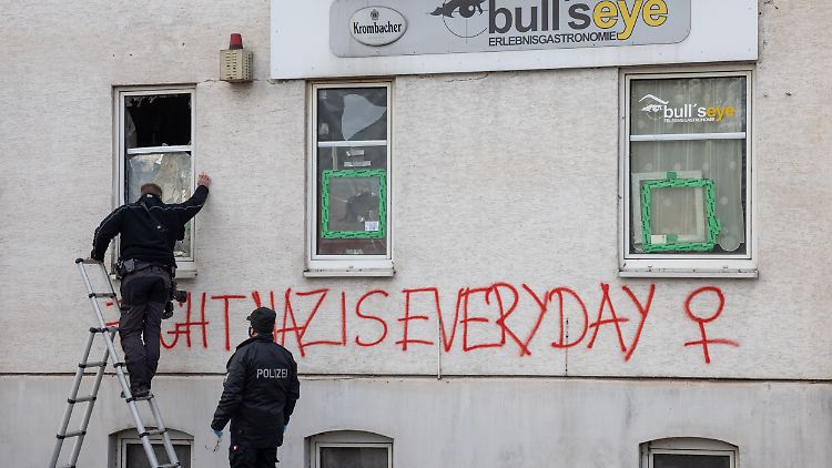 - An die Hauswand wurde der Schriftzug "Fight Nazis Every Day" gesprüht. Im Innern des Gebäudes soll auch Buttersäure verteilt worden sein. Nach Polizeiangaben wurde neben dem Gebäude auch ein abgestelltes Auto beschädigt.
