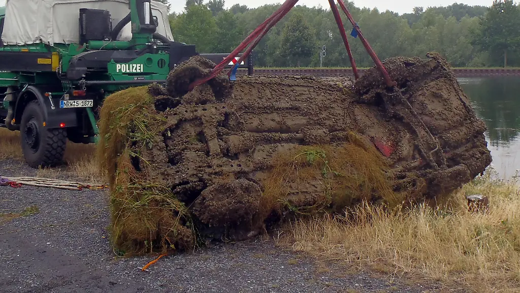 Manche Leute geben ihrem Auto einen Kosenamen. Sollte auch dieses Auto jemals von seinem Besitzer einen Namen bekommen haben, dann sollte ihn jetzt ein ganz schlechtes Gewissen plagen, finde ich. Denn dieses Auto haben Bochumer Polizeitaucher auf dem Grund des Dortmund-Ems-Kanals entdeckt. Sie machten bei Waltrop eine Übung, als sie auf das Wrack stießen. Es war voller Erde und mit Muscheln überwuchert. "Mit einem Kran konnte der stark deformierte Mazda aus dem Wasser gezogen werden", schrieb die Polizei später. Autokennzeichen oder eine Fahrgestellnummer hat sie nicht gefunden. Der Autobesitzer bleibt also anonym.