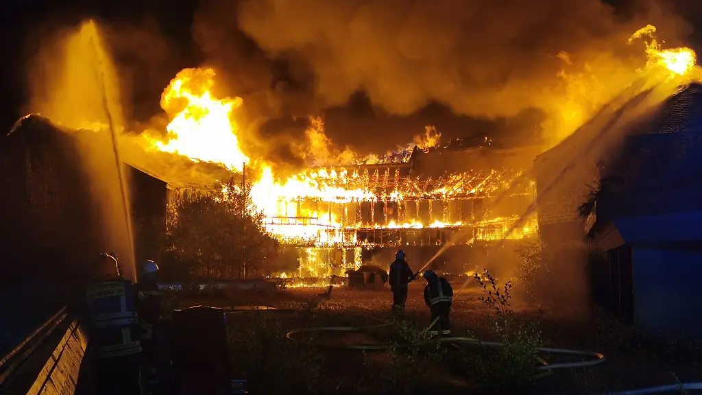 Als die ersten Einsatzkräfte eintrafen, schlugen demnach bereits meterhohe Flammen aus dem Dach des direkt an einen Wald angrenzenden Baus. Insgesamt waren rund 350 Feuerwehrleute im Einsatz.