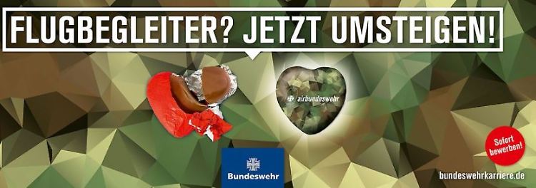 "Flugbegleiter? Jetzt umsteigen", steht auf einem Plakat der Bundeswehr am Flughafen Düsseldorf - darunter ein an die roten Air-Berlin-Schokoherzen angelehntes Herz in Tarnfleck-Optik. Mit dieser Stellenanzeige versucht die Luftwaffe Mitarbeiter der insolventen Fluggesellschaft abzuwerben. Die Anzeige ist kein PR-Gag: Tatsächlich hat die Luftwaffe 40 freie Stellen in der Flugbereitschaft zu besetzen.