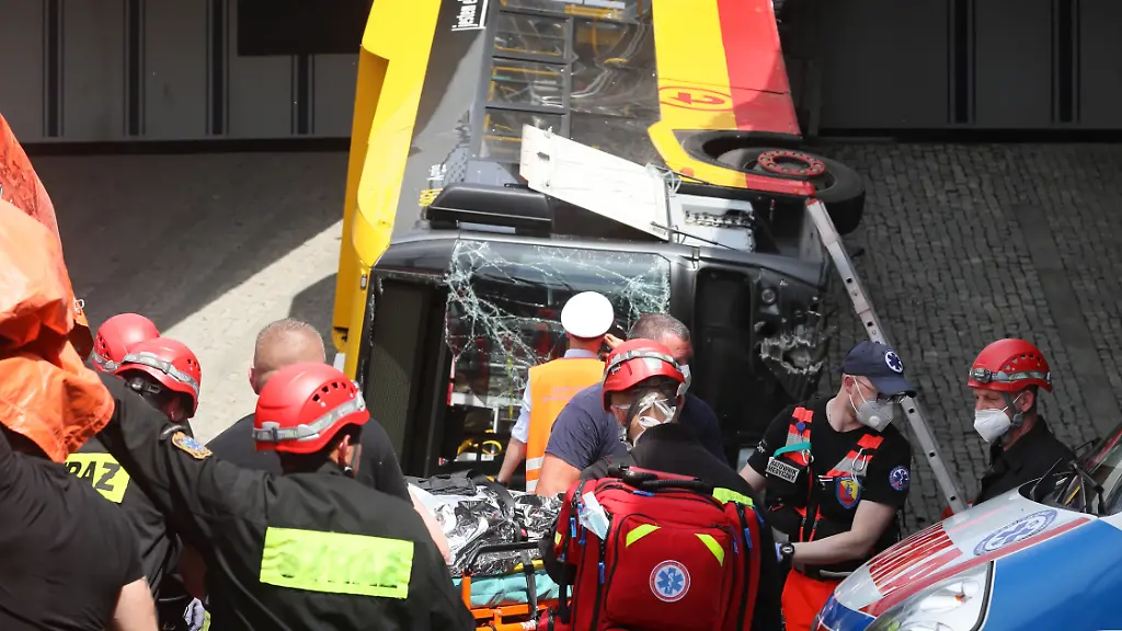 Aufnahmen des Senders TVN24 zeigen, dass das Vorderteil des Gelenkbusses von der Überführung einer Autobahn über eine Schnellstraße in die Tiefe gestürzt war. Der hintere Teil des Busses hängt noch fest. Sanitäter kümmern sich in einem Zelt um die Verletzten.