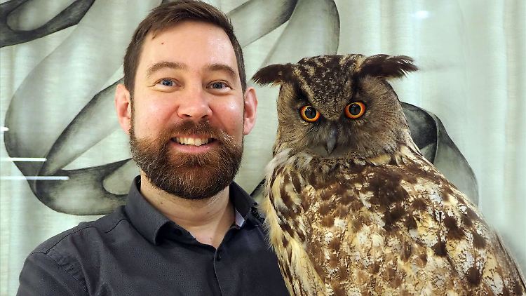Folmer Bokma und eines seiner Forschungsobjekte: ein Uhu.