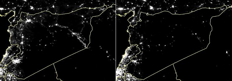 Syrien wird nach und nach zu einem zweiten Nordkorea - zumindest wenn man sich Satellitenaufnahmen ansieht, die die Universität von Wuhan und mehrere Hilfsorganisationen, darunter auch CARE, jetzt veröffentlicht haben. Sie zeigen das Land einmal im Jahr 2011 und heute. Es wird ersichtlich: In Syrien geht peu à peu buchstäblich das Licht aus. Der seit vier Jahren wütende Bürgerkrieg hat Häuser, Straßen, Schulen und Krankenhäuser zerstört hinterlassen. Zudem ist die Stromversorgung in weiten Teilen zusammengebrochen. Mittlerweile sind 83 Prozent Syriens nachts ohne Licht. In Aleppo sind es sogar 97 Prozent.