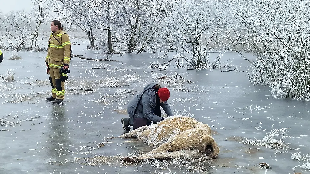 Auf Bildern ist zu sehen, wie tote Tiere im Eis stecken. Sie seien am Donnerstag auch nicht mehr frei zu kriegen, hieß es.