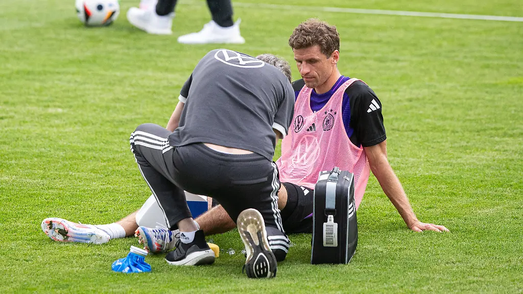 Thomas Müller hat das erste Training der Fußball-Nationalmannschaft in der Vorbereitung auf die Heim-EM angeschlagen beendet. Der 34 Jahre alte Angreifer vom FC Bayern München musste am Abend in Jena nach einem Schlag auf das linke Knie auf dem Platz behandelt werden. Er bekam von den DFB-Medizinern eine Bandage angelegt. Danach konnte der Offensivakteur jedoch noch Torschüsse abgeben und das Training normal beenden. Vom DFB kam nach der öffentlichen Übungseinheit vor 15.000 Fans Entwarnung. Es bestehe kein Grund zu größeren Sorgen, hieß es.