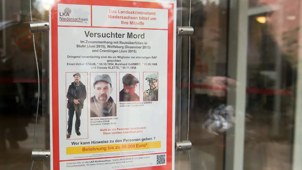 Gefahndet wird nach Ernst-Volker Staub, Burkhard Garweg und Daniela Klette. Sie sollen der RAF angehört haben, werden aber auch wegen einer Serie von zwölf Raubüberfällen von 1999 bis 2016 gesucht.