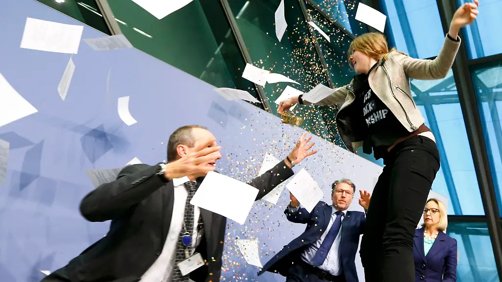 Sie sprang auf die Bühne und rief "ECB Dictatorship"