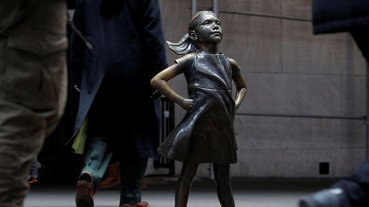 Sie ist ein beliebtes Foto-Motiv und erinnertan die Frauenrechte: Seit 2017 gibt es das "Fearless Girl" in Downtown Manhattan. Doch nun könnte das 1,20 Meter große Mädchen aus Bronze vor der Wall Street bald Geschichte sein. Die Genehmigung der Statue des "Furchtlosen Mädchens" vor der berühmten New Yorker Börse lief vor wenigen Tagen aus. Aktivisten und die Künstlerin kämpfen für ihren Verbleib. "Ich bin hier, um zu bekräftigen, warum das Kunstwerk erhalten bleiben sollte und warum es wichtig ist", sagte Bildhauerin Kristen Visbal. Lokale Behörden in New York müssen nun entscheiden, was mit dem "Fearless Girl" geschehen soll. 2017 starrte es zunächst eineinhalb Jahre lang die berühmte Statue des "Wall-Street-Bullen" wenige Meter entfernt an. Danach zog es vor die Börse und schaute zu dem wichtigen internationalen Handelsplatz hinauf.