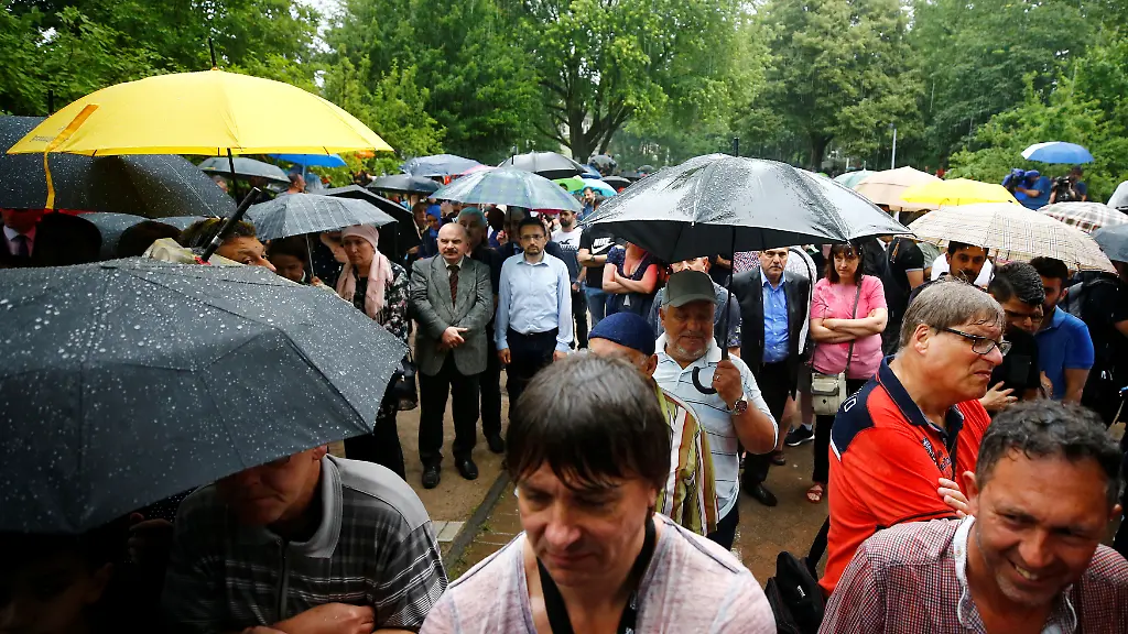 Hunderte Teilnehmer flüchten sich unter den Schutz von Bäumen als überm Gedenkakt in Solingen plötzlich ein Wolkenbruch niedergeht. Nun wurde die Veranstaltung abgebrochen - in deutscher und türkischer Sprache wurden die Menschen zum Gehen aufgefordert. Daher konnten Außenminister Maas und sein türkischer Amtskollege Cavusoglu ihre Reden nicht mehr halten.