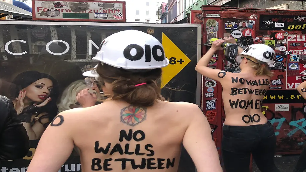 Am Frauentag wird allerorten demonstriert - auch in Hamburg. Mit nacktem Oberkörper und schwerem Gerät haben mehrere Aktivistinnen auf der Reeperbahn einen Sichtschutz abmontiert.