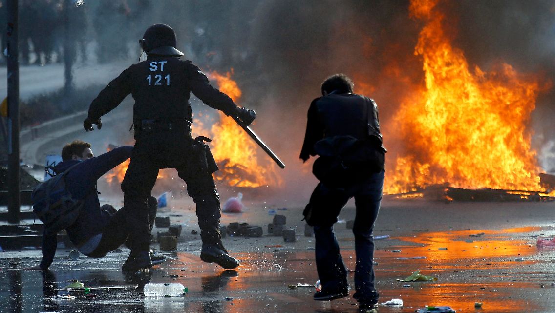 - Gewalttätige Demonstranten haben nach Angaben der Polizei auch Feuerwehr und Straßenbahnen mit Steinen beworfen.