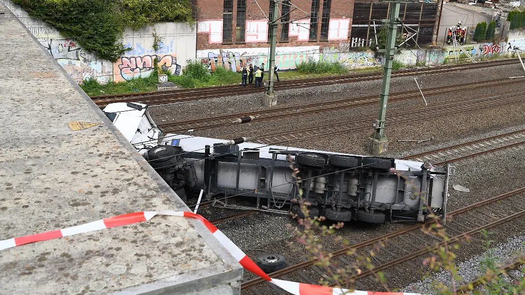 Der TagLKW stürzt von Brücke auf Gleise - Fahrer in Klinik, Strecke gesperrt