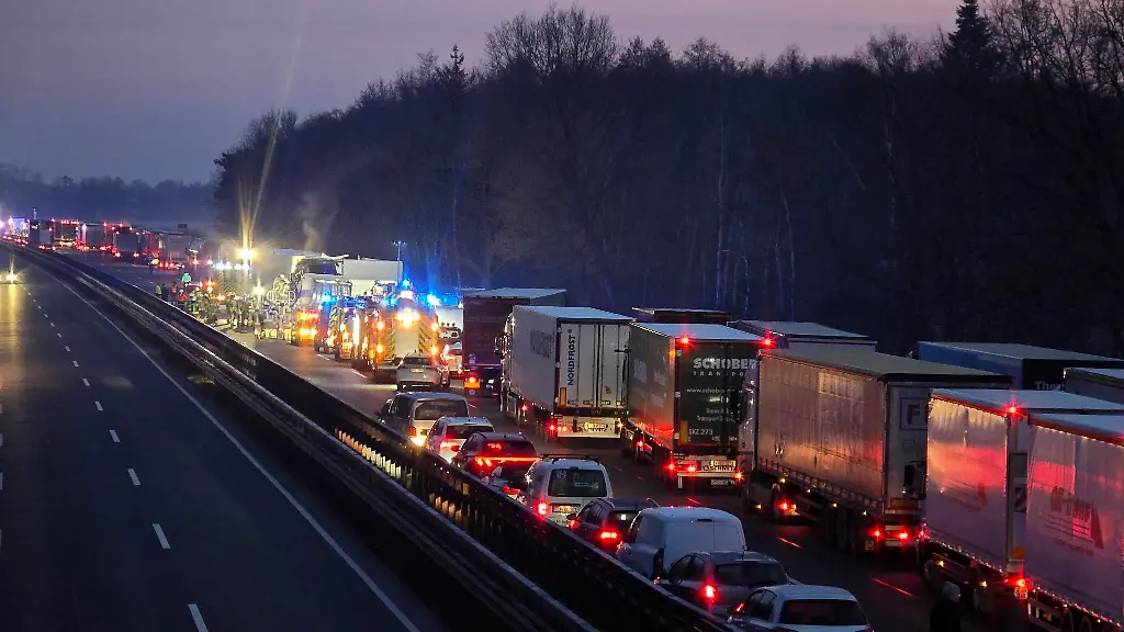 Auf der Autobahn 1 ist es am frühen Morgen zu einem folgeschweren Unfall gekommen: Zunächst kollidierte ein Auto auf der Fahrbahn in Richtung Hamburg mit einem Lkw. Dabei erlitt ein Mensch tödliche Verletzungen. Wie die Polizei Delmenhorst mitteilt, sind danach weitere Menschen aus dem Fahrzeug eigenständig ausgestiegen und von der Unfallstelle zu Fuß geflüchtet. Durch den Unfall staute sich der Verkehr, sodass am Ende zwei Lastwagen kollidierten, wobei ebenfalls ein Mensch ums Leben kam. Die Polizei setzte einen Hubschrauber ein, um die weggelaufenen Menschen aufzuspüren. Die Autobahn war am Morgen deshalb voll gesperrt.