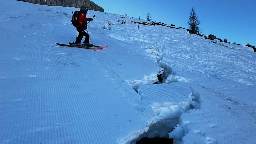 Der Spurenchef ist entsetzt! In seinen 30 Jahren Berufserfahrung habe er so etwas noch nie gesehen: Eine der steilsten Skipisten der Schweiz ist wegen eines plötzlichen Risses geschlossen worden. Ursache seien die milden Temperaturen, bestätigte der Chef des Skigebiets Glacier 3000 im Kanton Waadt, Bernhard Tschannen. Die Piste ist seit Dienstag geschlossen.