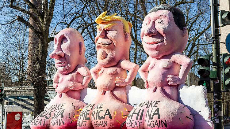 Ein anderer Motivwagen in Düsseldorf zeigte Trump zusammen mit Putin und dem chinesischen Präsidenten Xi Jinping - alle drei stellen hüllenlos dicke Eier zur Schau. "Alle drei Großmächte sind in den Händen von antidemokratischen Despoten - das ist die Botschaft", so Tilly.
