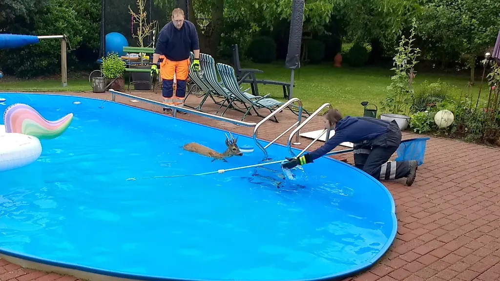 Ein Reh hat sich im niedersächsischen Hanstedt nahe Hamburg in einen Garten verirrt und ist in einen Swimmingpool gefallen. Die freiwillige Feuerwehr konnte das Tier aber retten, wie sie mitteilte. Das Reh habe sich nicht allein aus dem Becken befreien können, Anwohner riefen deshalb die Einsatzkräfte. Mit beherzten Handgriffen habe man das Reh aus dem Pool geholt und in ein nahes Feld gebracht. "Dort freigelassen, sprang das Reh, offensichtlich unverletzt und fit, in großen Schritten davon", berichtete ein Sprecher der freiwilligen Feuerwehr.