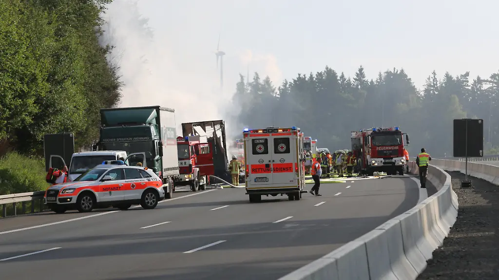 Schwerer Unfall auf der A9 in Oberfranken: Ein Reisebus fährt bei Münchberg im Landkreis Hof auf einen Sattelschlepper auf. "Wir müssen von einem sehr schweren Verkehrsunfall ausgehen", sagte ein Sprecher des Polizeipräsidiums Bayreuth. Es gebe mehrere Verletzte, möglicherweise auch Schwerverletzte. Auf die Frage, ob es Tote geben könnte, antwortete er Sprecher: "Wir können derzeit nichts ausschließen." Der Bus geriet nach dem Aufprall in Brand.