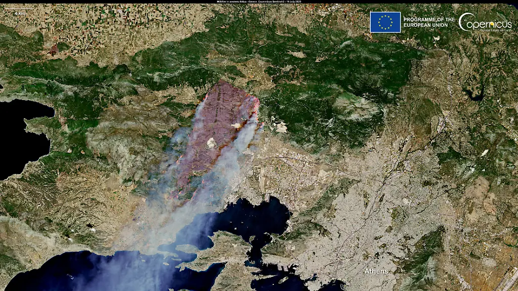 Seit Tagen kämpfen Feuerwehrkräfte rund um Athen gegen die Flammen. Hitze und kräftiger Wind erschweren die Löscharbeiten, aber heute kann die Einsatzzentrale in der griechischen Hauptstadt etwas Entwarnung geben: zwei der drei großen Waldbrände - die Feuer nördlich und westlich von Athen - sind inzwischen weitgehend unter Kontrolle. Die Lage sei deutlich besser, sagte ein Sprecher der Feuerwehr am Morgen dem Radiosender Skai. Wie verheerend die Waldbrände in Griechenland wüten, können Sie auf den Satellitenbildern sehen: