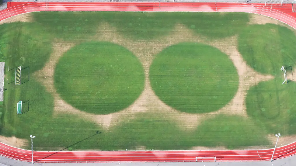 Waren Außerirdische in Baden-Württemberg zugange? Oder sagen die mysteriösen Kreise im Fußballstadion von Bad Buchau etwa kommende Ergebnisse voraus? Nichts dergleichen: Das heiße Wetter ist für das eigenartige Rasenmuster verantwortlich.