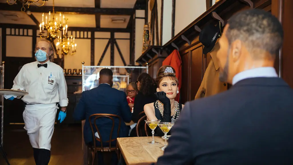 Mit "Frühstück bei Tiffany"-Ikone Audrey Hepburn am Tisch sitzen oder mit Jon Hamm alias Don Draper aus "Mad Men" auf einen Drink am Tresen? Das geht ab sofort in einem New Yorker Steak-Restaurant. Das hat Wachsfiguren von Stars aufgestellt, um seinen Gästen in der Corona-Pandemie beim Abstand halten zu helfen. Die Wachsfiguren stammten aus dem Museum Madame Tussauds und sollten bis Anfang März in dem Lokal Peter Luger im Stadtteil Brooklyn bleiben, teilten die Betreiber beider Einrichtungen mit. Zu sehen ist auch der Moderator Jimmy Fallon. Den Restaurants in New York war in der Pandemie erst vor kurzem erlaubt worden, ihre Innenräume wieder mit eingeschränkter Kapazität und unter Einhaltung von Masken-, Hygiene- und Abstandsregeln zu öffnen.