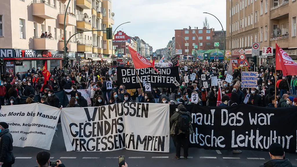 Tausende Menschen haben in Berlin bei einer Demonstration an die Opfer des rassistisch motivierten Anschlags im hessischen Hanau vor einem Jahr erinnert. Im Stadtteil Neukölln versammelten sich nach Einschätzung der Polizei rund 4000 Teilnehmer. Angemeldet waren ursprünglich 900 Teilnehmer. Von Neukölln aus setzte sich der Zug nach Berlin-Kreuzberg in Bewegung.