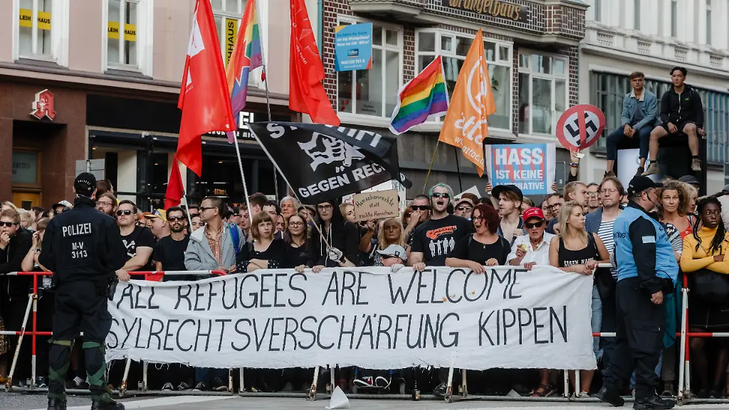 Die Gegendemonstranten zogen in zwei getrennten Aufzügen durch die Innenstadt in Richtung Gänsemarkt, wo sich laut Polizei etwa 125 Menschen zur "Merkel muss weg"-Kundgebung einfinden. Unter den Teilnehmern ist auch die Nummer zwei der fremdenfeindlichen Pegida aus Dresden, Siegried Daebritz.