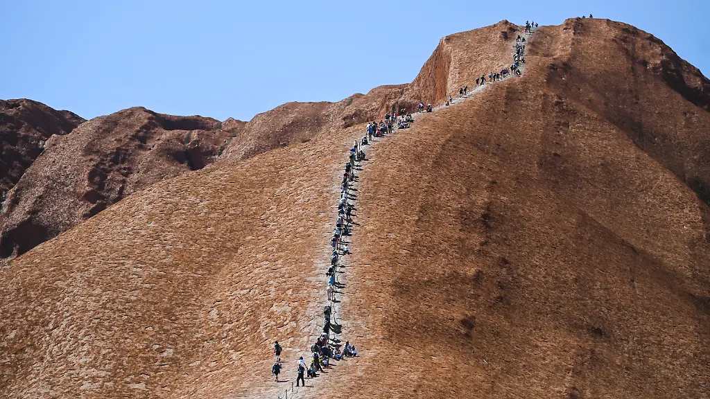 An Australiens bekanntestem Berg, dem Uluru - früher auch Ayers Rock genannt -, ist der Klettersteig ein letztes Mal geöffnet worden. Hunderte Touristen versammelten sich am Fuß des 348 Meter hohen roten Felsens in der australischen Wüste, um den Aufstieg in Angriff zu nehmen. Allerdings mussten sie sich gedulden, weil die Parkverwaltung den Weg nach oben wegen starken Windes nicht freigab. Erst nach drei Stunden Wartezeit wurde die Sperrung aufgehoben.