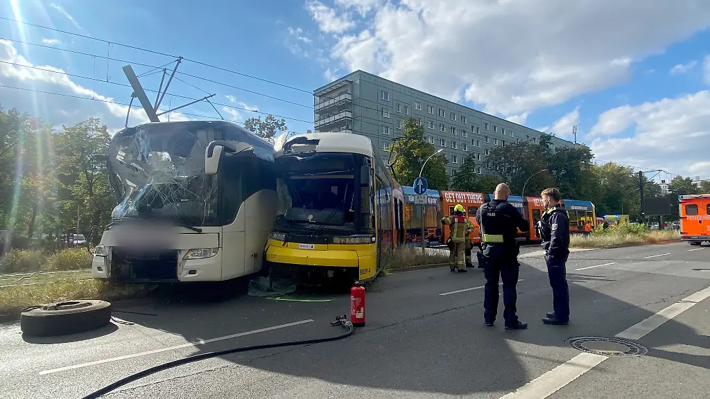 Der Bus, der aus dem europäischen Ausland stammt und die Straßenbahn stießen demnach auf der Mollstraße etwa auf der Höhe der Berolinastraße zusammen. Die Tram fährt dort in der Mitte der breiten Straße, die Autos jeweils rechts und links in mehreren Spuren. Bus und Tram wurden im Frontbereich zerstört. Der Bus wurde auch noch gegen die Stromleitungen der Tram gedrückt, die Straßenbahn entgleiste. 60 Feuerwehrleute waren im Einsatz.